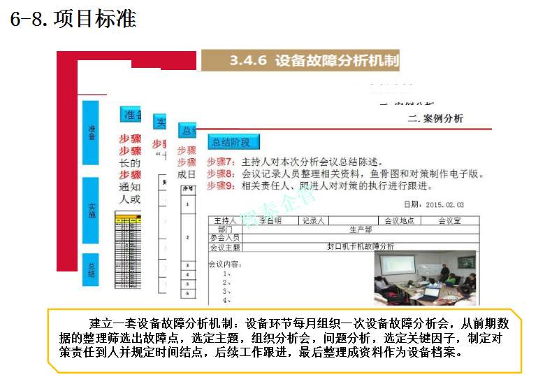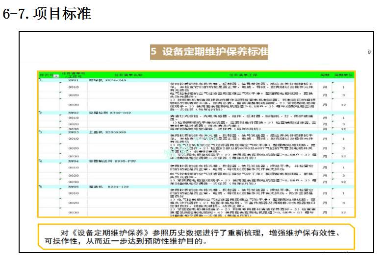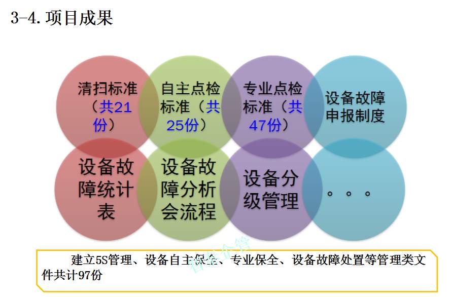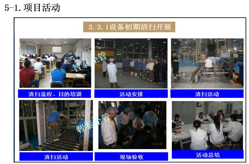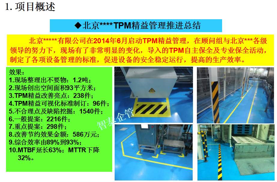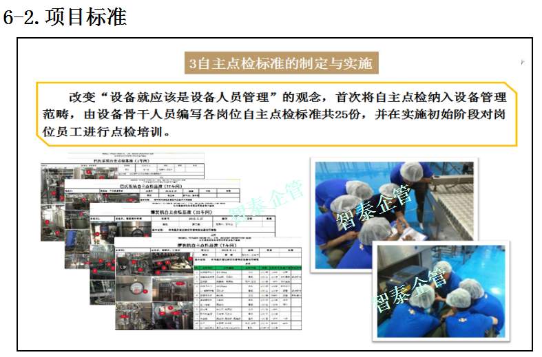 智泰咨詢下屬的TPM咨詢公司為企業(yè)推進的TPM管理活動中,為企業(yè)設(shè)備故障率下降推進了大量的制度及標準,通過TPM全員參與活動,消除設(shè)備的缺陷并改善及復原,并對設(shè)備進行部分改良,促進設(shè)備長期穩(wěn)定運行,提高設(shè)備生產(chǎn)綜合效率,附件為智泰咨詢專業(yè)團隊在某企業(yè)推進的TPM管理實錄,請查閱: