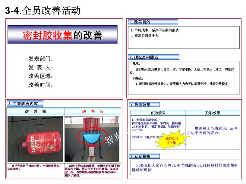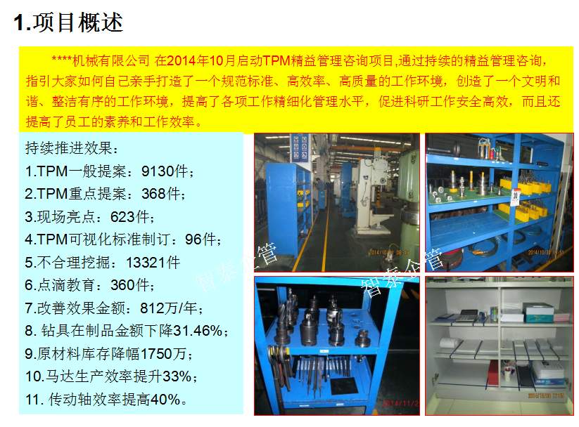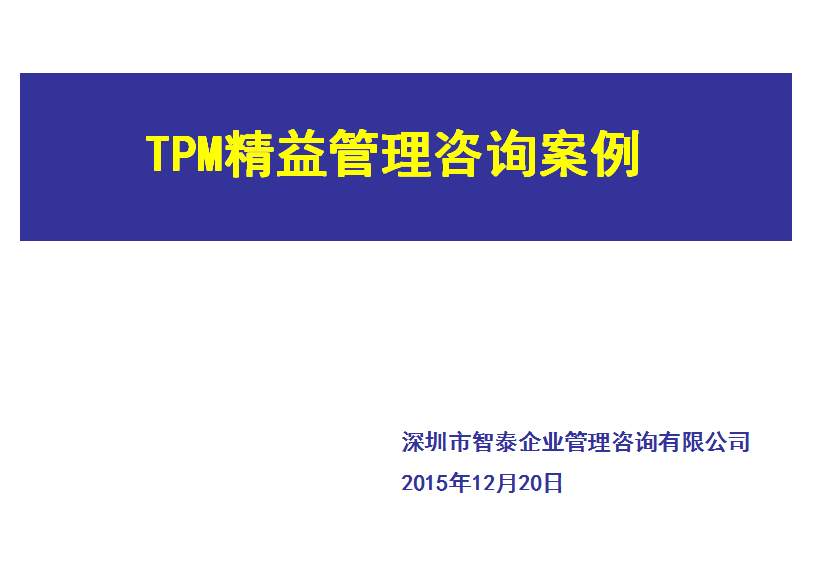 深圳智泰下屬TPM咨詢公司推進(jìn)的TPM管理不僅僅是設(shè)備管理,而是企業(yè)的全面改善,智泰專業(yè)團(tuán)隊(duì)以現(xiàn)場三現(xiàn)為主展開企業(yè)的持續(xù)改進(jìn),全面推進(jìn)TPM全員改善活動,幫助企業(yè)提升6S管理水平,培養(yǎng)優(yōu)秀人才,促進(jìn)企業(yè)可持續(xù)發(fā)展,最終達(dá)成行業(yè)標(biāo)桿,附件為智泰咨詢顧問團(tuán)隊(duì)在某企業(yè)TPM管理推進(jìn)的成功案例,請查閱: