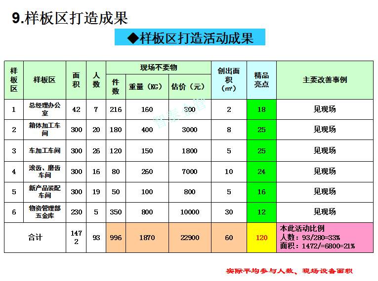 深圳智泰下屬6S咨詢公司在國內對不同行業(yè)推進6S管理,98%以上取得非常滿意的效果,智泰專業(yè)團隊三天為企業(yè)打造成功6~8個標桿車間,6S咨詢公司快速為企業(yè)達成6S管理目標而努力奮斗,企業(yè)要想成為行業(yè)的標桿,必須持續(xù)推進現(xiàn)場管理,比如6S或TPM管理等,現(xiàn)場管理好的企業(yè)不一定是標桿企業(yè),但標桿企業(yè)的現(xiàn)場管理一定是優(yōu)秀的。附件為企業(yè)6S管理推進總結內容,請查閱: