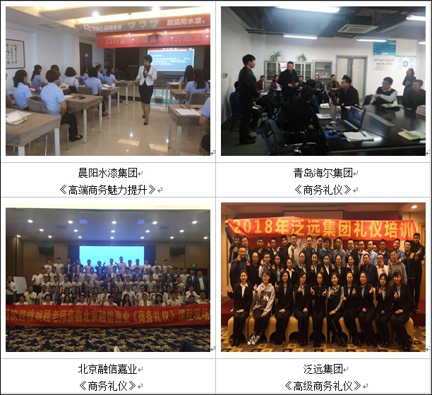 ▲曾為美的、以純、青島海爾集團(tuán)、寧紡集團(tuán)等10余家家紡電器企業(yè)進(jìn)行《商務(wù)禮儀》《接待與宴請(qǐng)禮儀》《現(xiàn)代職場(chǎng)商務(wù)禮儀與交往藝術(shù)》課程培訓(xùn),其中,《商務(wù)禮儀》課程被海爾大學(xué)返聘8期。