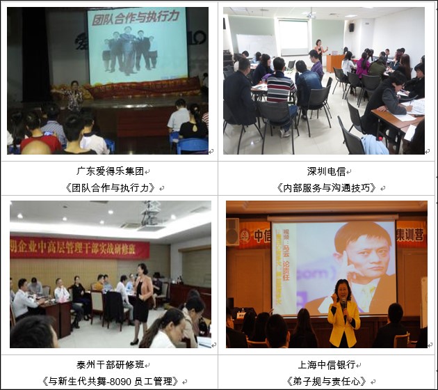 各類企業(yè):大慶集團(tuán)、河南郵政、新興鑄管、江西新余鋼鐵、中國核二建集團(tuán)、中航工業(yè)沈飛集團(tuán)、浙江國技互聯(lián)信息技術(shù)有限公司[溫州百度]、一汽大眾成都分公司、益陽移動、中石化華北油氣分公司、中國電信、廣州電信、珠海郵政、深圳地鐵集團(tuán)、深圳百康健康、大琢投資、琢子文化、廣東南航、佛山愛得樂集團(tuán)、順德區(qū)大良科技、廣東精藝金屬股份有限公司、光大房地產(chǎn)、中科科技發(fā)展、廣東金剛工程、冠捷電子、深圳鵬都興實業(yè)、佛山偉仕達(dá)電器有限公司、佳隆股份、理丹電器、建華管樁、深圳TCL、廣東嘉晟生物科技、天安數(shù)碼城集團(tuán)、廣東高速通驛集團(tuán)、華企商學(xué)院等。