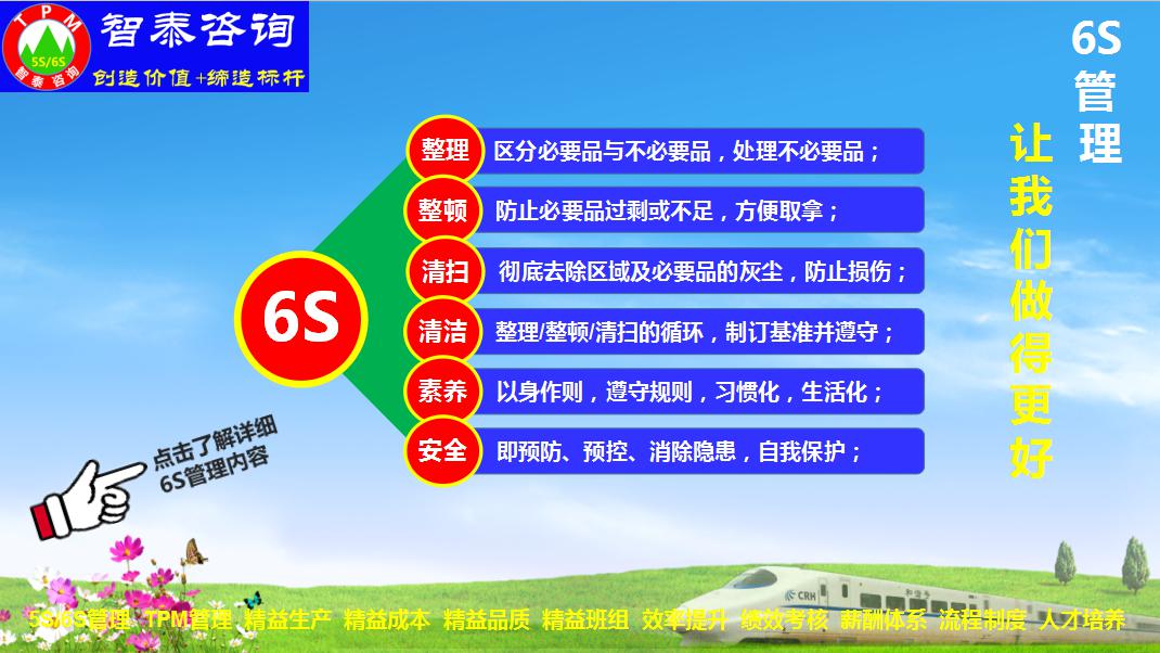 智泰咨詢公司在企業(yè)推進(jìn)6S管理中,為了確保6S管理能夠快速展開并結(jié)出成果,還會(huì)導(dǎo)入其它的管理工具來輔助6S管理的推進(jìn)。以下是各個(gè)管理工具的簡介。
